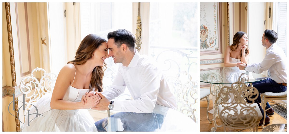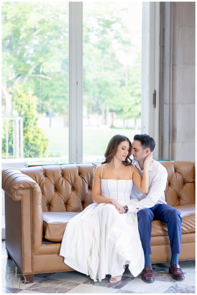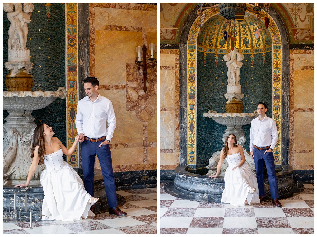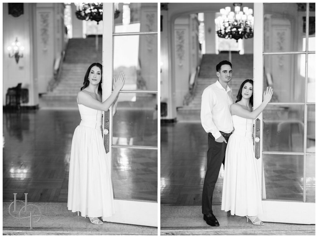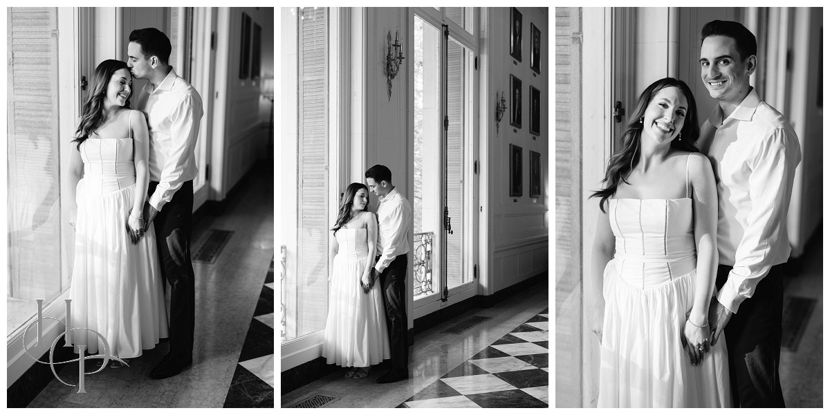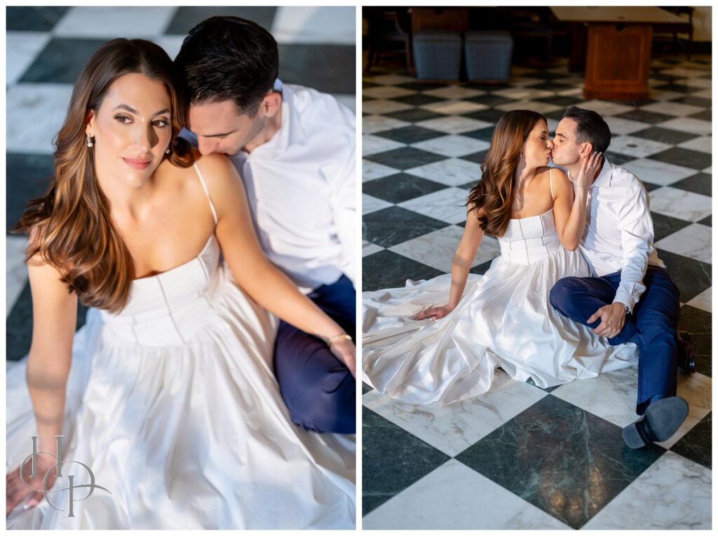 Monmouth University offered an abundance of photographic opportunities that are simply enchanting! The arching stone hallways create a dramatic backdrop, while the checkered floors add a playful touch to our shots. One of our favorite moments of their session was when positioned the bride-to-be on the elegant checkered floor of the University Hall. The golden light cascaded on the patterned floor, perfectly framing Mary and Austin!