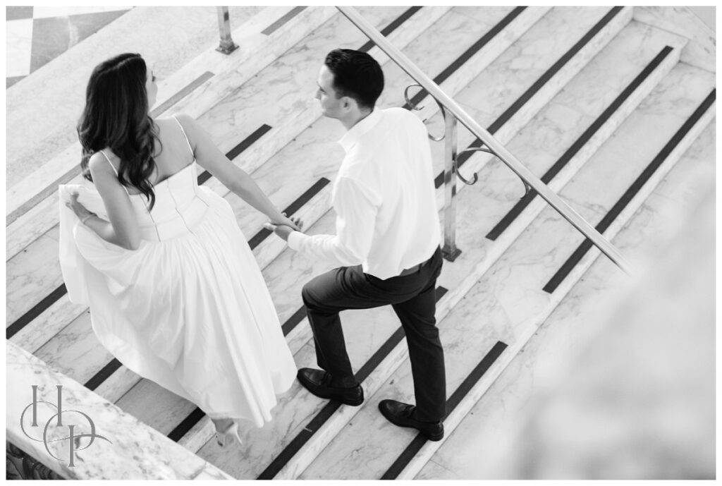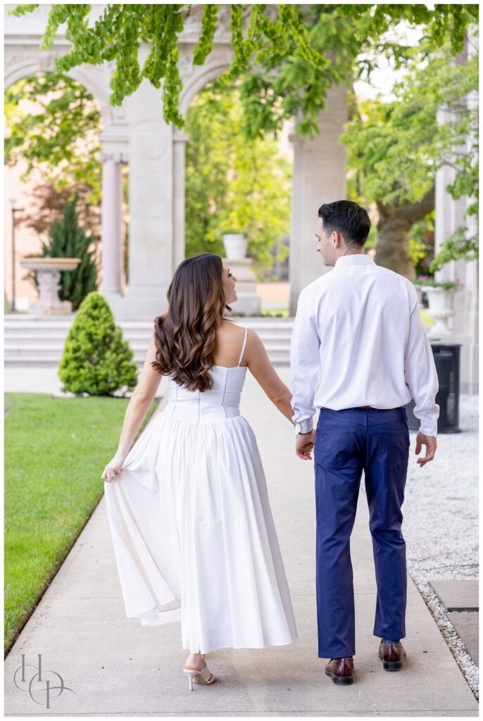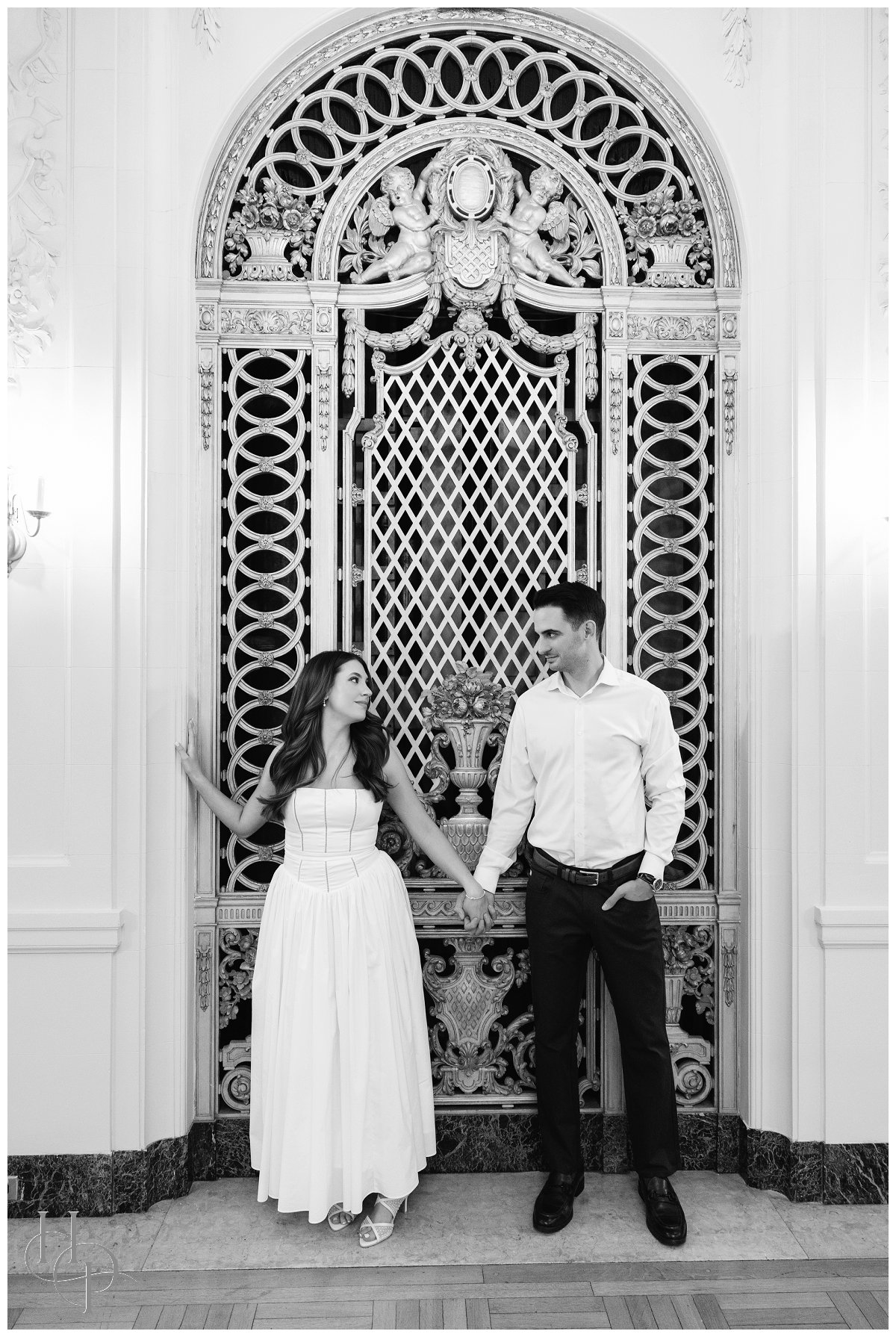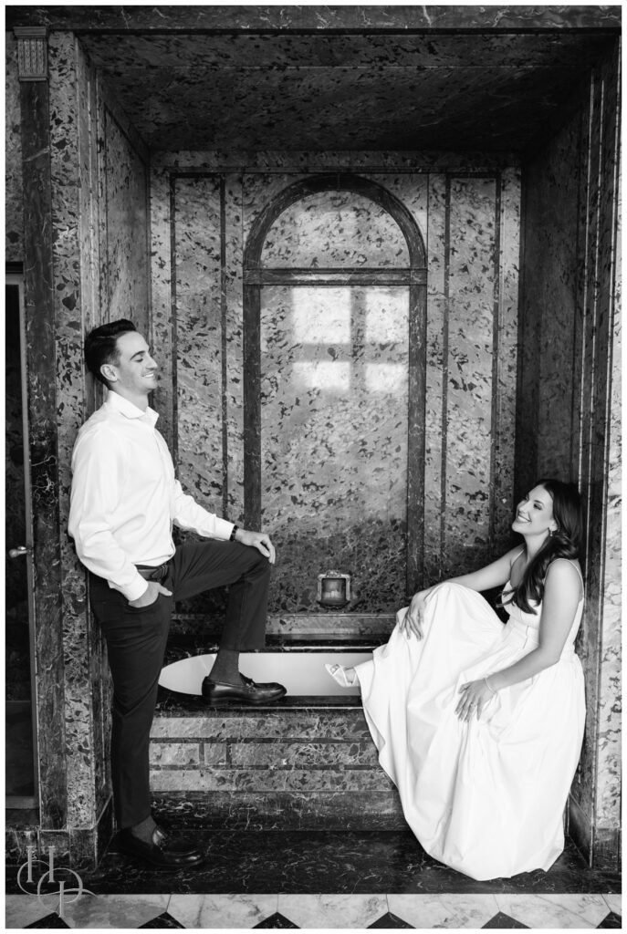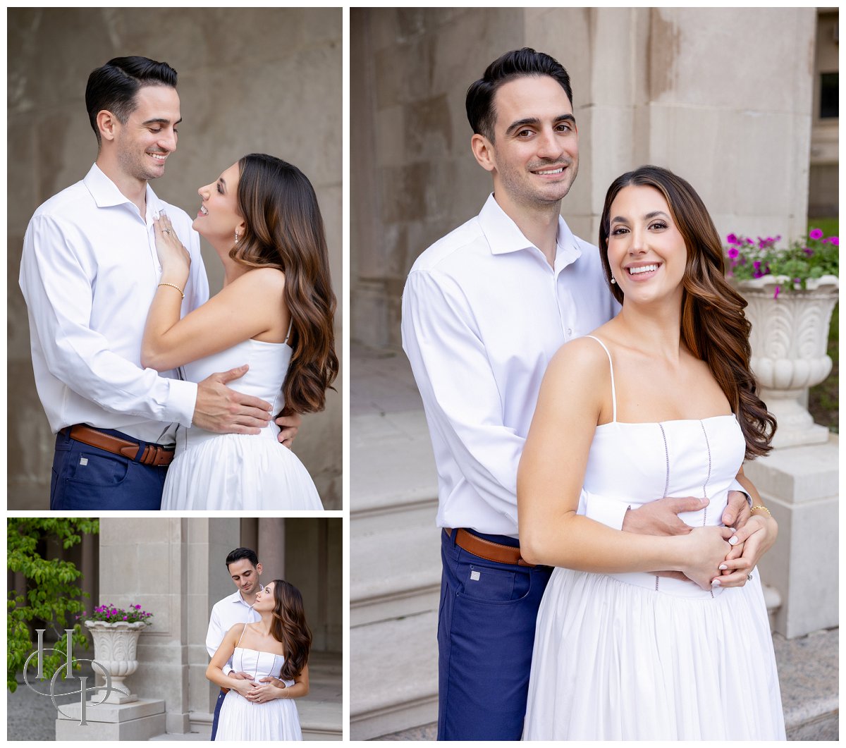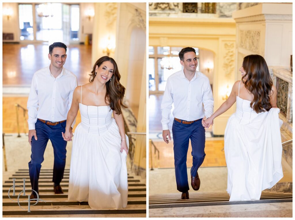 Monmouth University offered an abundance of photographic opportunities that are simply enchanting! The arching stone hallways create a dramatic backdrop, while the checkered floors add a playful touch to our shots. One of our favorite moments of their session was when positioned the bride-to-be on the elegant checkered floor of the University Hall. The golden light cascaded on the patterned floor, perfectly framing Mary and Austin!
