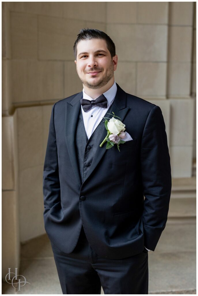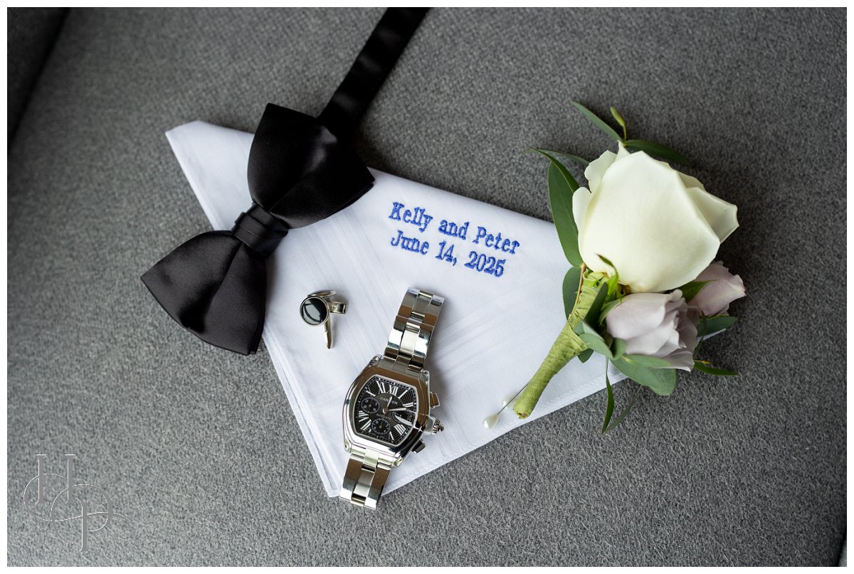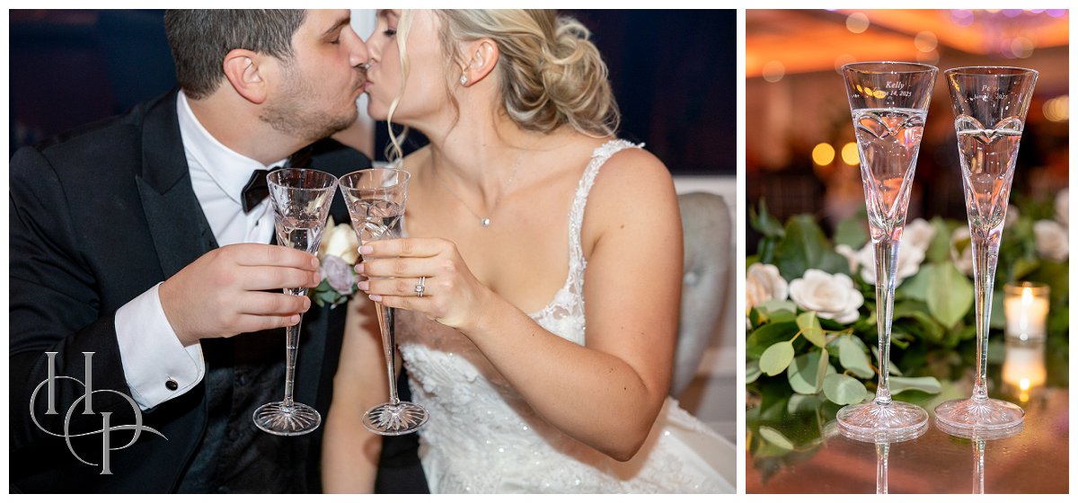 Peter definitely struck a few fun, candid poses while getting ready with his father, brushing off any nervousness with laughter. Kelly quelled her own butterflies with a champagne toast surrounded by her bridesmaids and mom before slipping into her gorgeous wedding dress, intricately designed with an abundance of detail. Her veil was particularly stunning with its lace detail that cascading well past the hem of her gown!