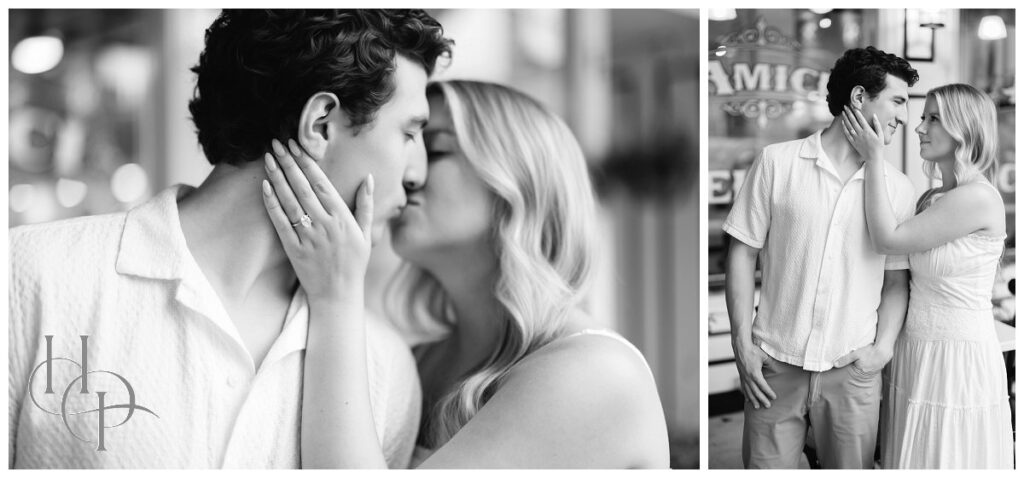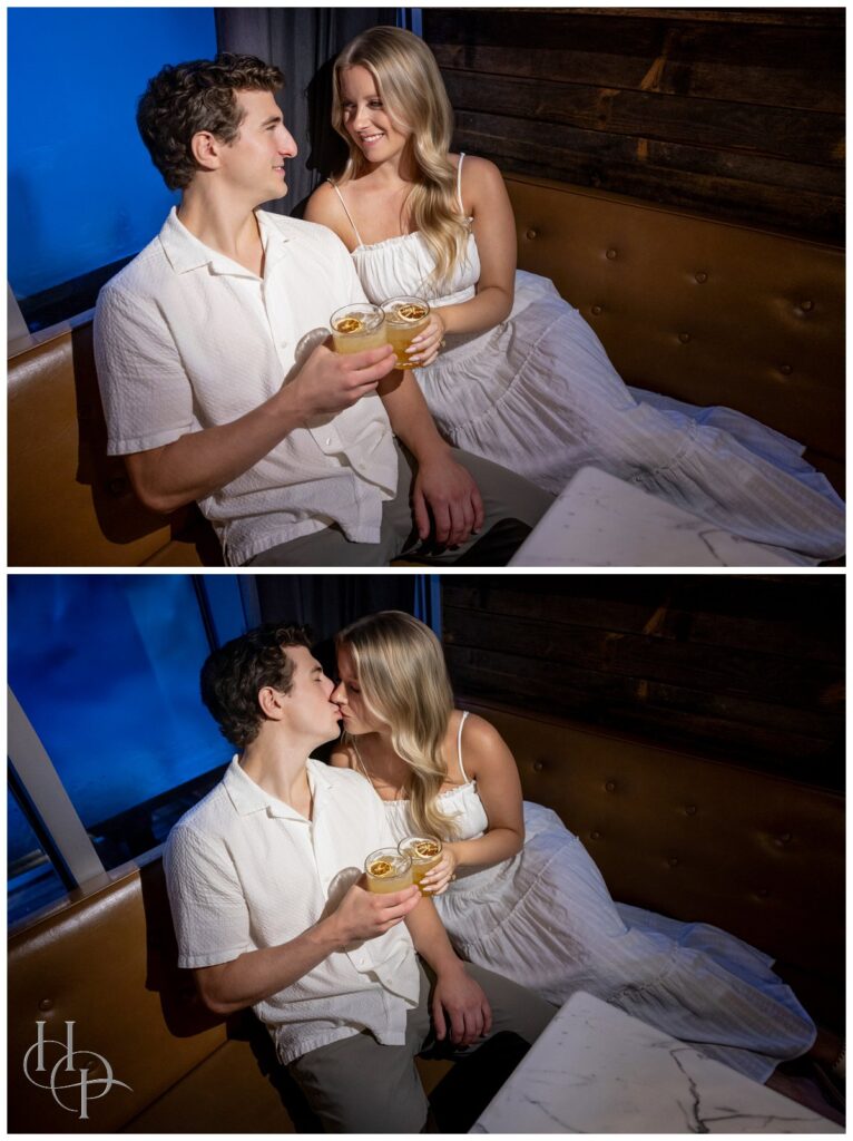 We ducked into a neighborhood favorite—a dimly-lit bar adorned with vintage art and tufted leather booths. Our couple slid into a comfy corner, fingers entwined, glasses clinking in a gentle cheers to the next chapter. The scene felt like a frame from an old romantic film: her eyes sparkled, his smile spoke volumes, and for a brief moment, the world melted away, leaving nothing but togetherness and anticipation for what’s to come.