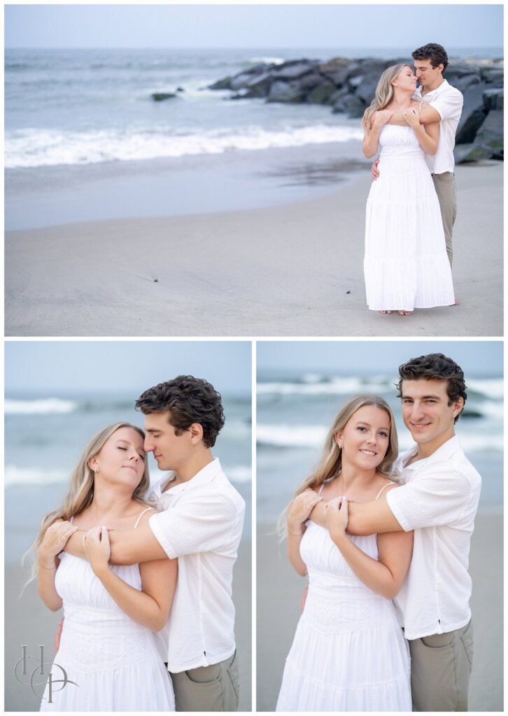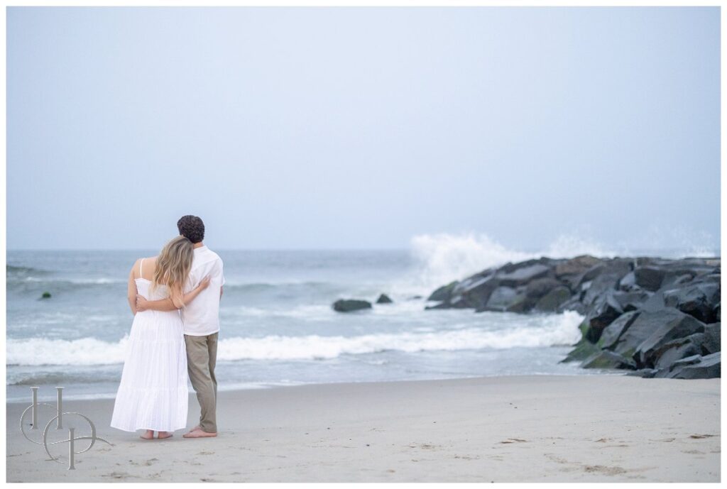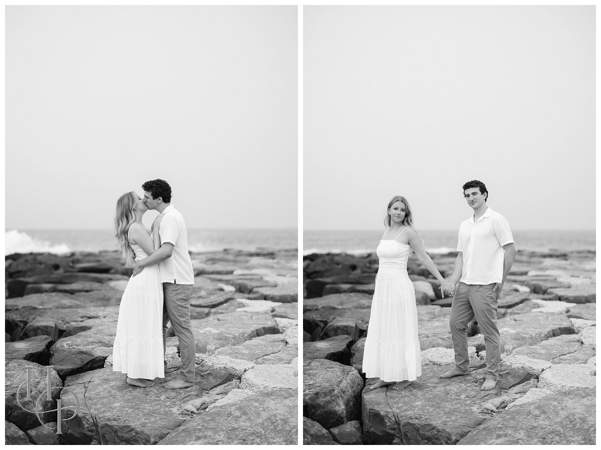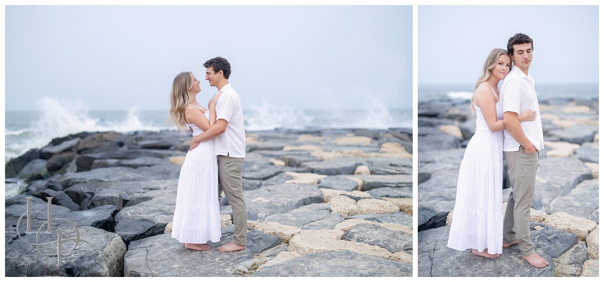 The stroll continued as the couple twirled and held hands, making their way toward the shore. The salty Atlantic breeze played with Kristen’s hair as they drew closer to the beach, the pastel sky softening the afternoon. On the rocky outcroppings just beyond the boardwalk, our couple positioned themselves atop the rocks as the waves crashed behind them, casting a fine mist of sea spray that caught the sunlight in shimmering strands. Together, they paused and breathed it all in—the salt, the light, the sense of infinite possibility!