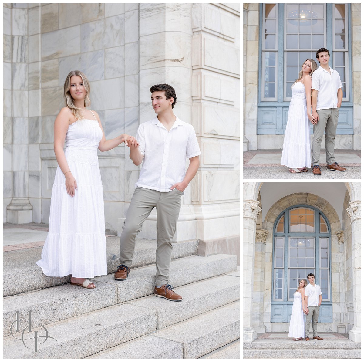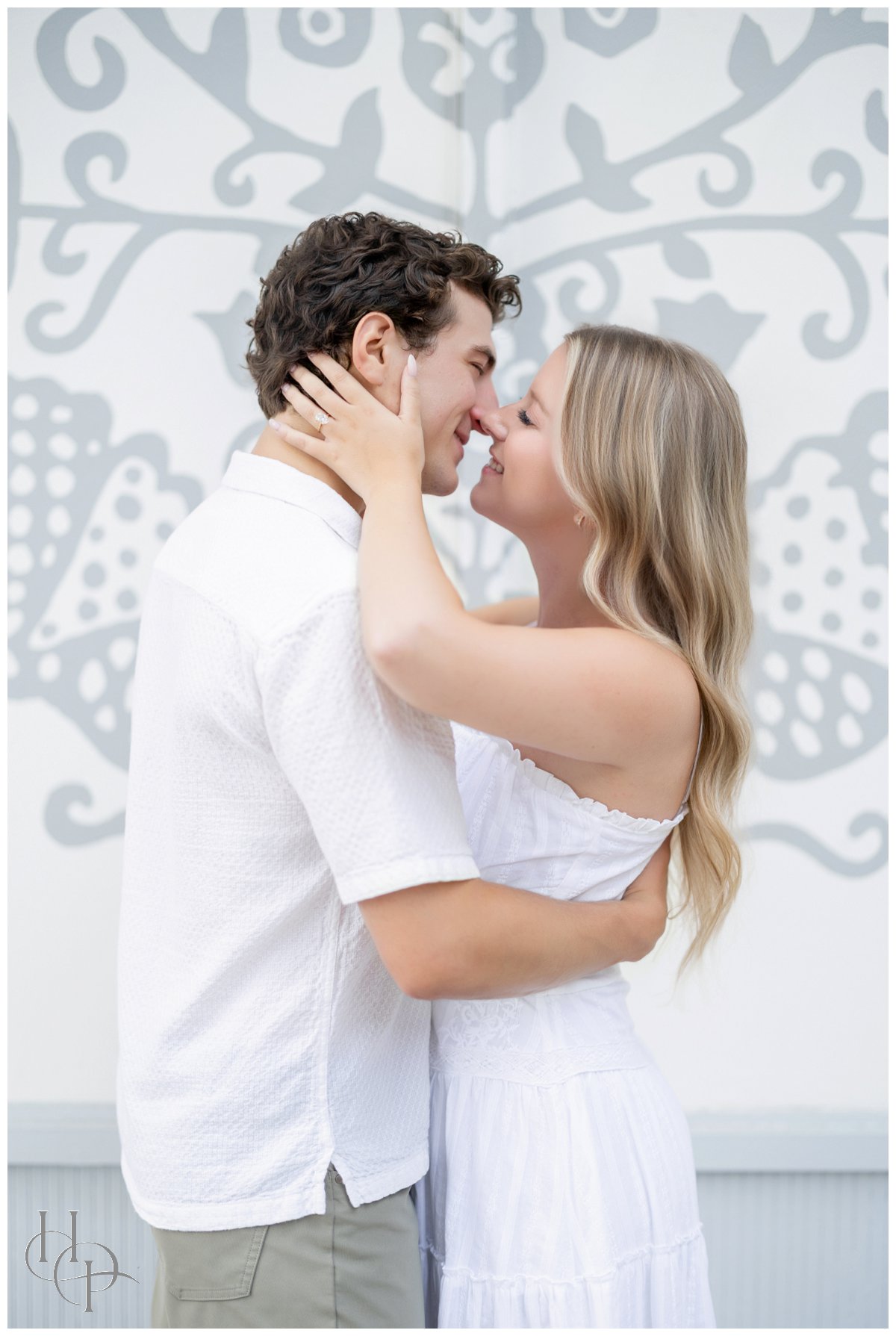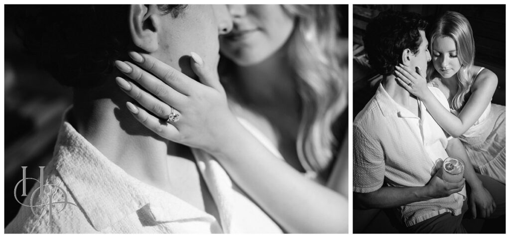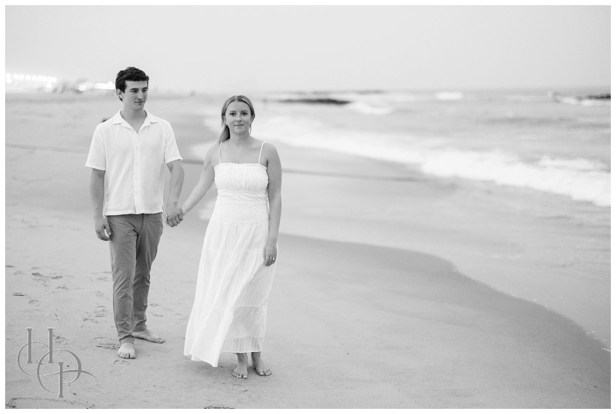 The stroll continued as the couple twirled and held hands, making their way toward the shore. The salty Atlantic breeze played with Kristen’s hair as they drew closer to the beach, the pastel sky softening the afternoon. On the rocky outcroppings just beyond the boardwalk, our couple positioned themselves atop the rocks as the waves crashed behind them, casting a fine mist of sea spray that caught the sunlight in shimmering strands. Together, they paused and breathed it all in—the salt, the light, the sense of infinite possibility!