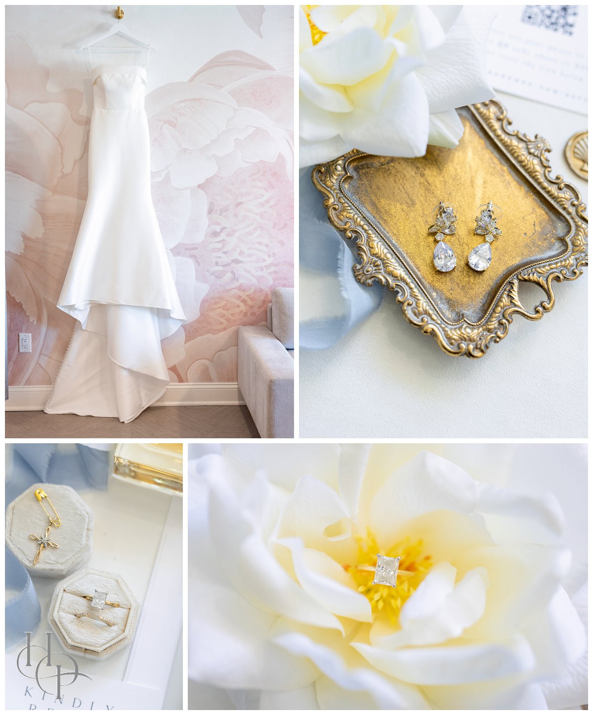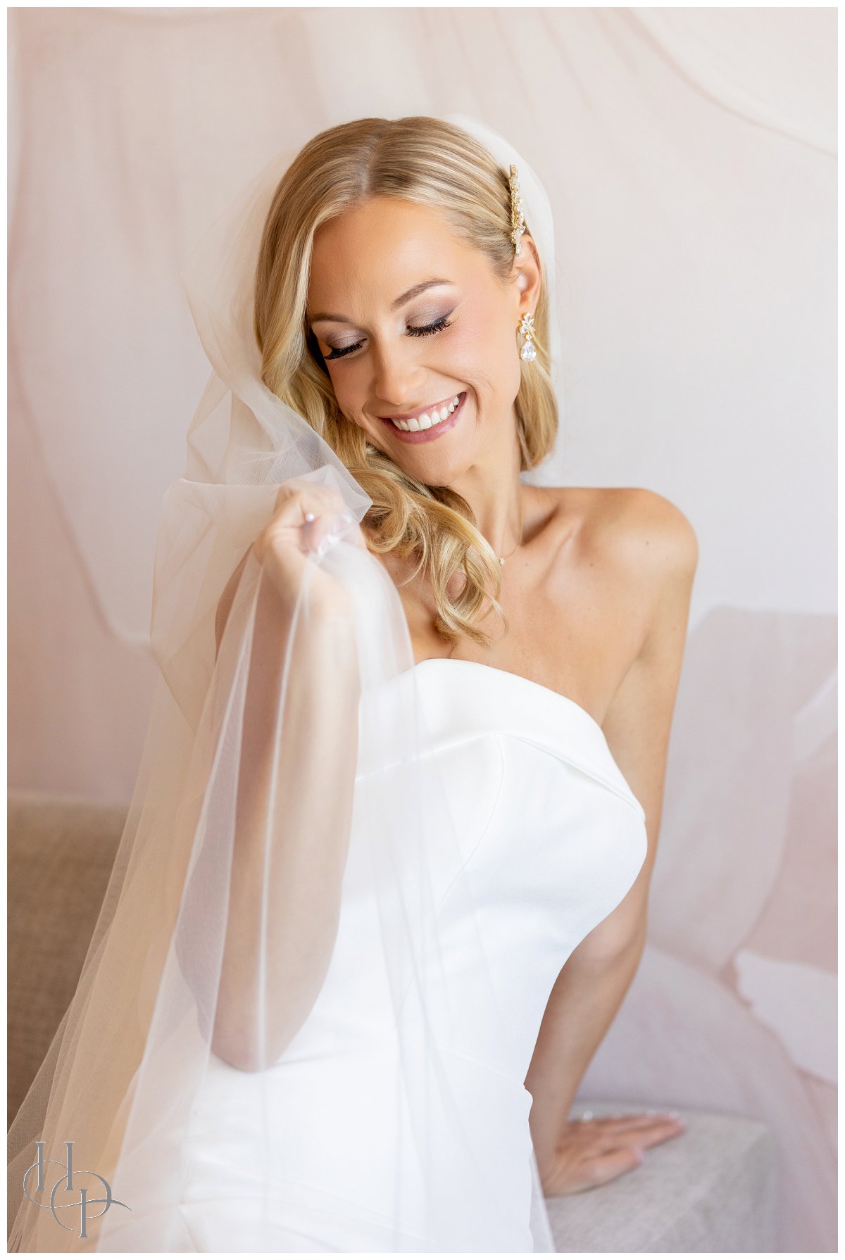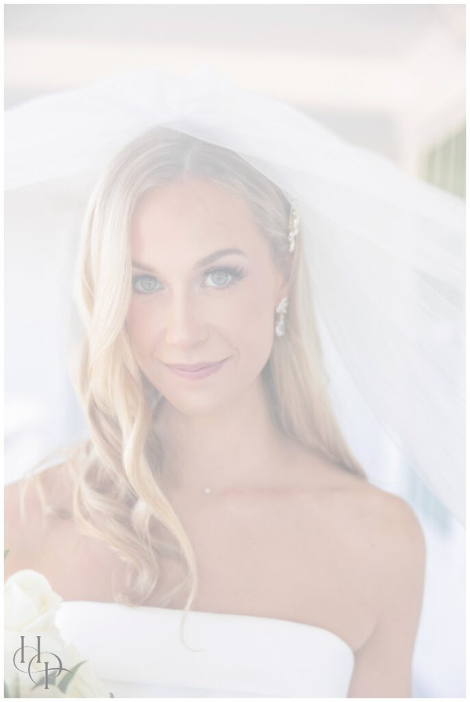The bride was the picture of graceful poise, wearing a classic white gown with a tapered, strapless bodice—a dress that seemed made for her! Lush waves of hair cascaded past her shoulders, softly lifted by the summer breeze, and golden jeweled hair accessories sparkled delicately. Her style married understated luxury with pure romance, catching the light as she twirled on the dance floor or gently squeezed her partner’s hand.