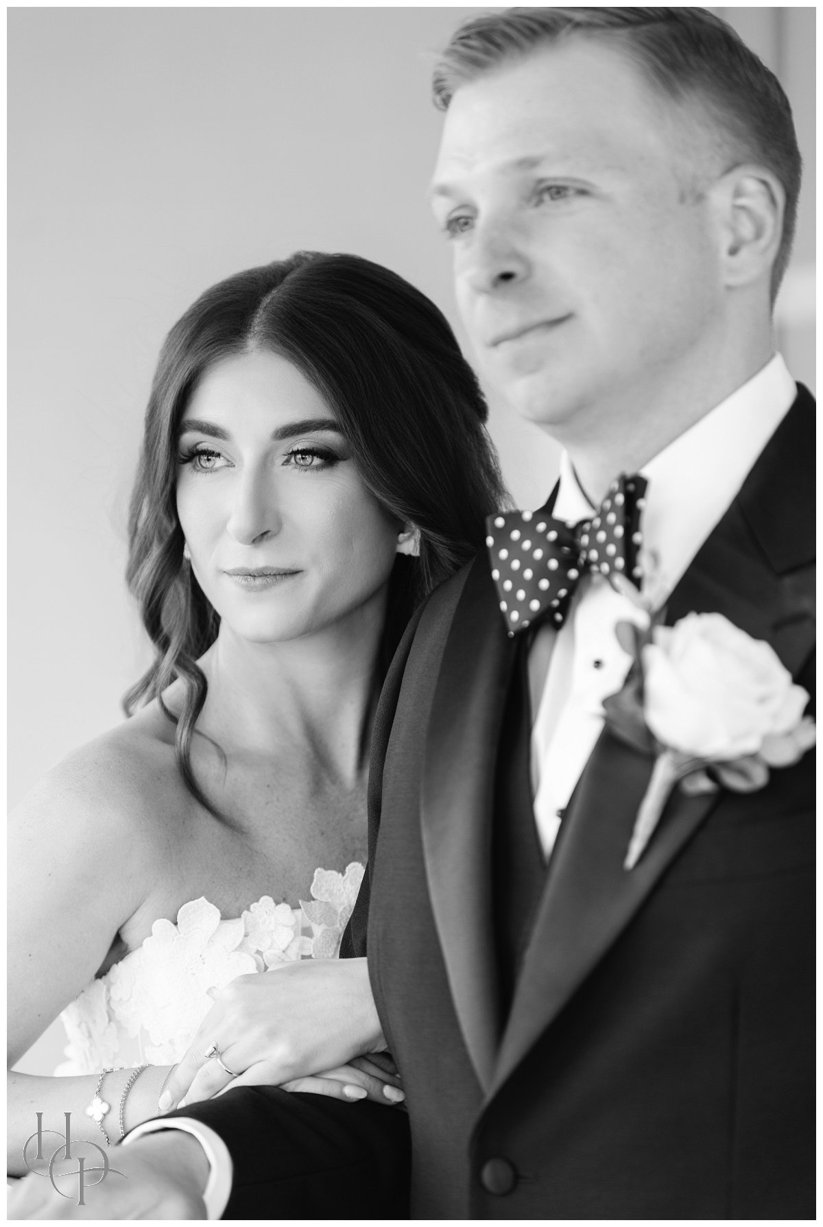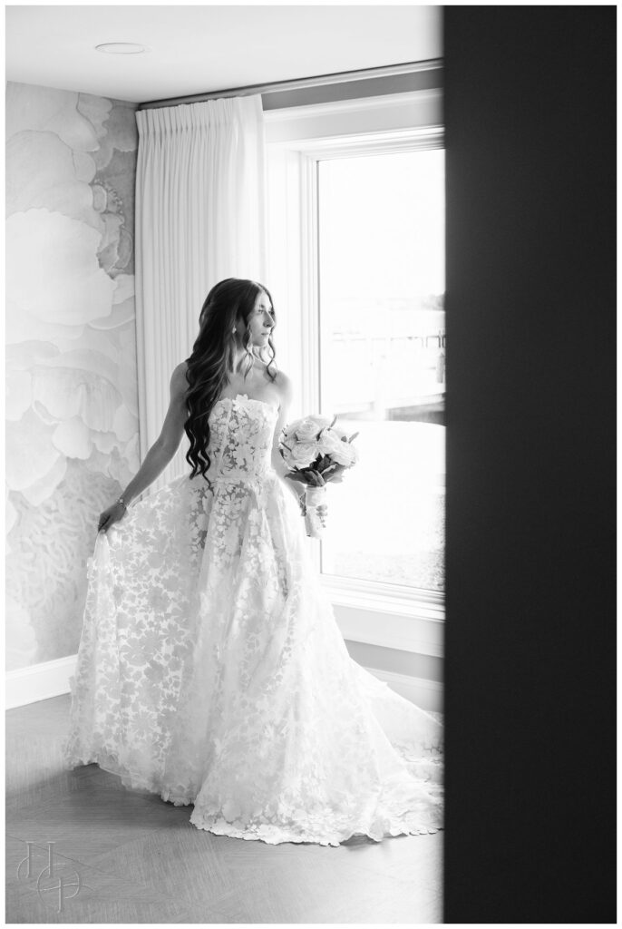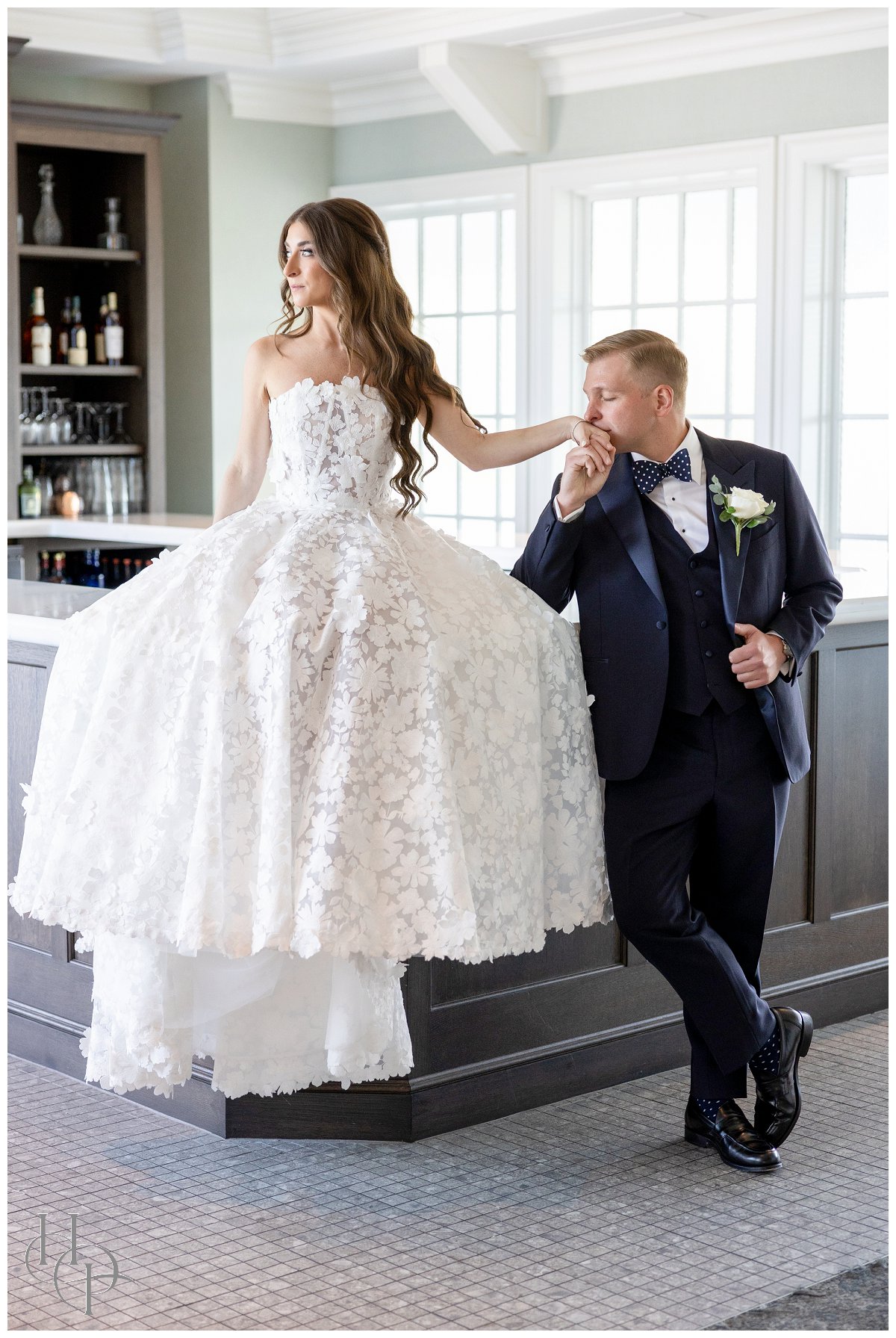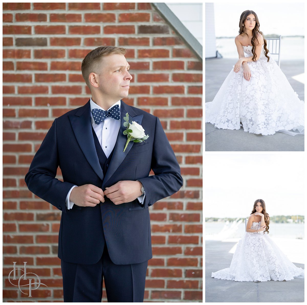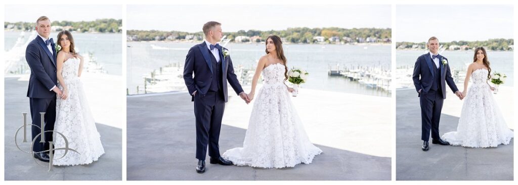 The weather could not have been more perfect: The sun shone brilliantly over the marina, bathing the patio at Clark’s Landing in warm, golden light. As the couple stepped outside onto the waterfront terrace, any lingering nerves seemed to dissolve in the soft breeze and gentle sunshine. With the sea stretching out behind them, we captured some of the most romantic portraits of the day. The interplay of light on the water, the sweep of the bride’s gown, and the way the groom looked at her—all of it came together to create images that felt effortless and deeply genuine. These quiet moments on the patio became a peaceful pause amid the excitement: a chance for the two of them to breathe, take in the view, and reflect on the life they were about to begin together on the other side of the world.