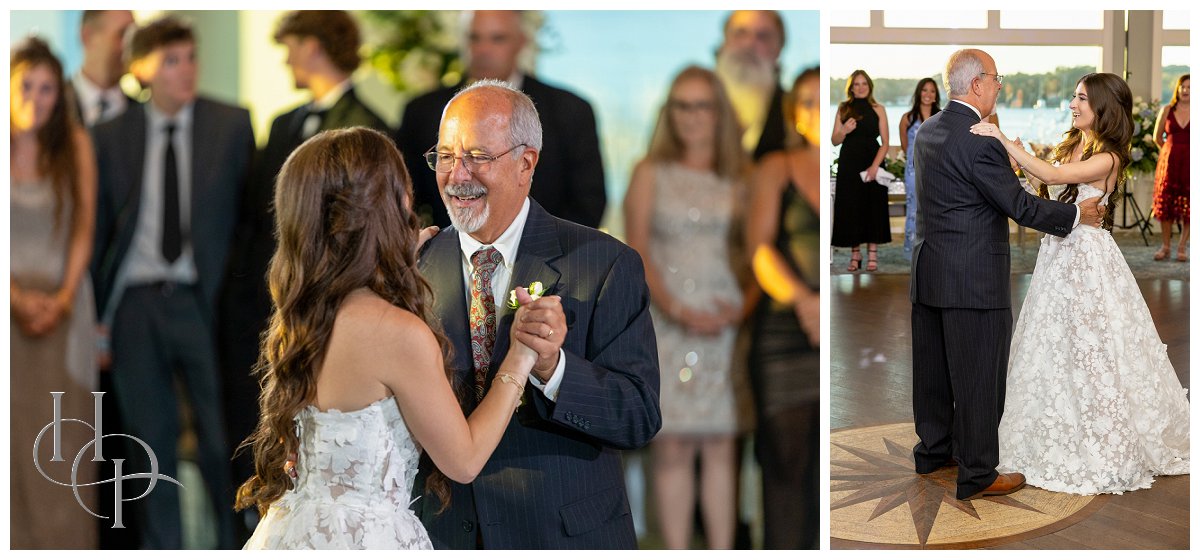 From the ceremony, the celebration flowed seamlessly into the opulent ballroom at Clark’s Landing. Guests were welcomed into a space that perfectly reflected the couple’s vision: warm, inviting, and elegantly coastal. Hydrangea arrangements anchored the décor, spilling out of vases in soft clouds of blue and white, grounded by lush greenery. Blue anchor table markers added a charming maritime touch, while gold accents along the tables—chargers, cutlery, candle holders—brought a sense of grandeur and glow. The couple’s entrance as husband and wife was met with a wave of cheers and applause, the room erupting in celebration as they twirled into the ballroom. It was a moment of pure joy, brimming with energy and anticipation for the night ahead!